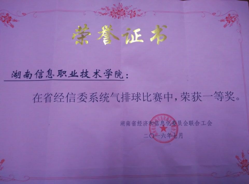 7月13日,校领导赵兴舟书记亲自带队,在工会和体育部的组织下我校教职工十二人参加了湖南省经信委第一届气排球比赛,并取得了第一名的优异成绩。