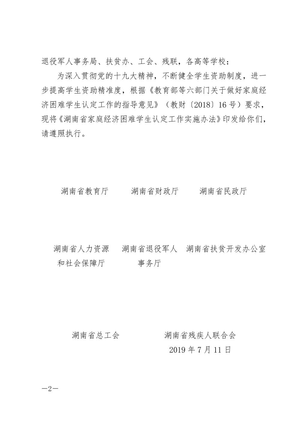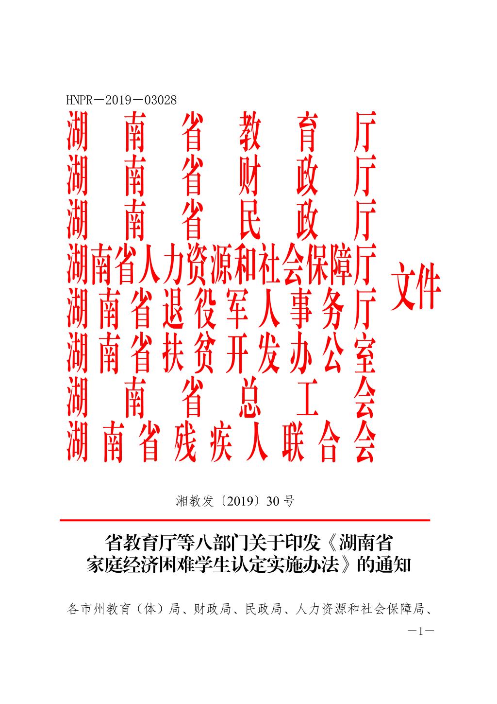 湘教发[2019]30号 省教育厅等八部门关于印发《湖南省家庭经济困难学生认定实施办法》的通知(1).doc