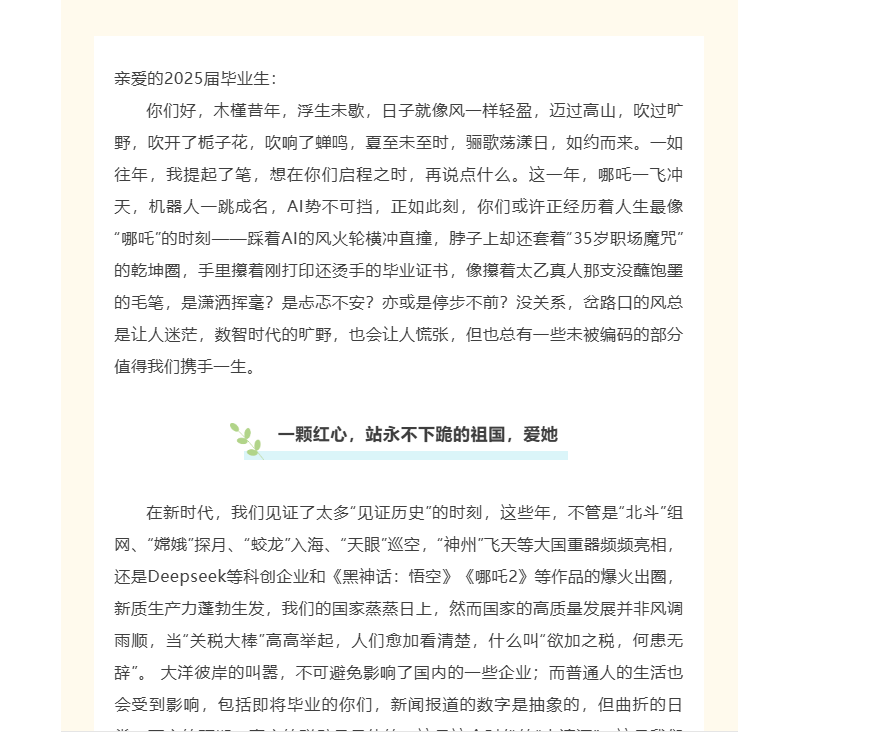 毕业季里,“你们的刘老师”深情寄语,和同学们聊一聊学习生活状况,讲一讲“过来人”的人生阅历,分享人生箴言,纸短情长,2000字写不完对“孩子们”的挂念,装不下同学们追逐的“星辰大海”,桃李不言下自成蹊,毕业生送上的白色“哈达”,让这份真挚的师生情谊隽永流长。