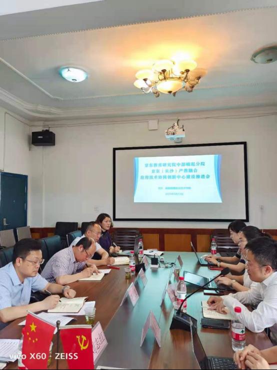 2021年5月13日上午,京东教育研究院和beat365官方网站在beat365芙蓉校区共同召开了京东(长沙)产教融合应用技术协同创新中心建设推进会。出席会议的有beat365党委书记贺代贵、党委副书记院长陈剑旄、副院长刘志红、副院长苏基协及各职能部门负责人,京东方面出席会议的有全国职业教育信息化联席会议秘书长孙文升等六人,会议由副院长苏基协主持。