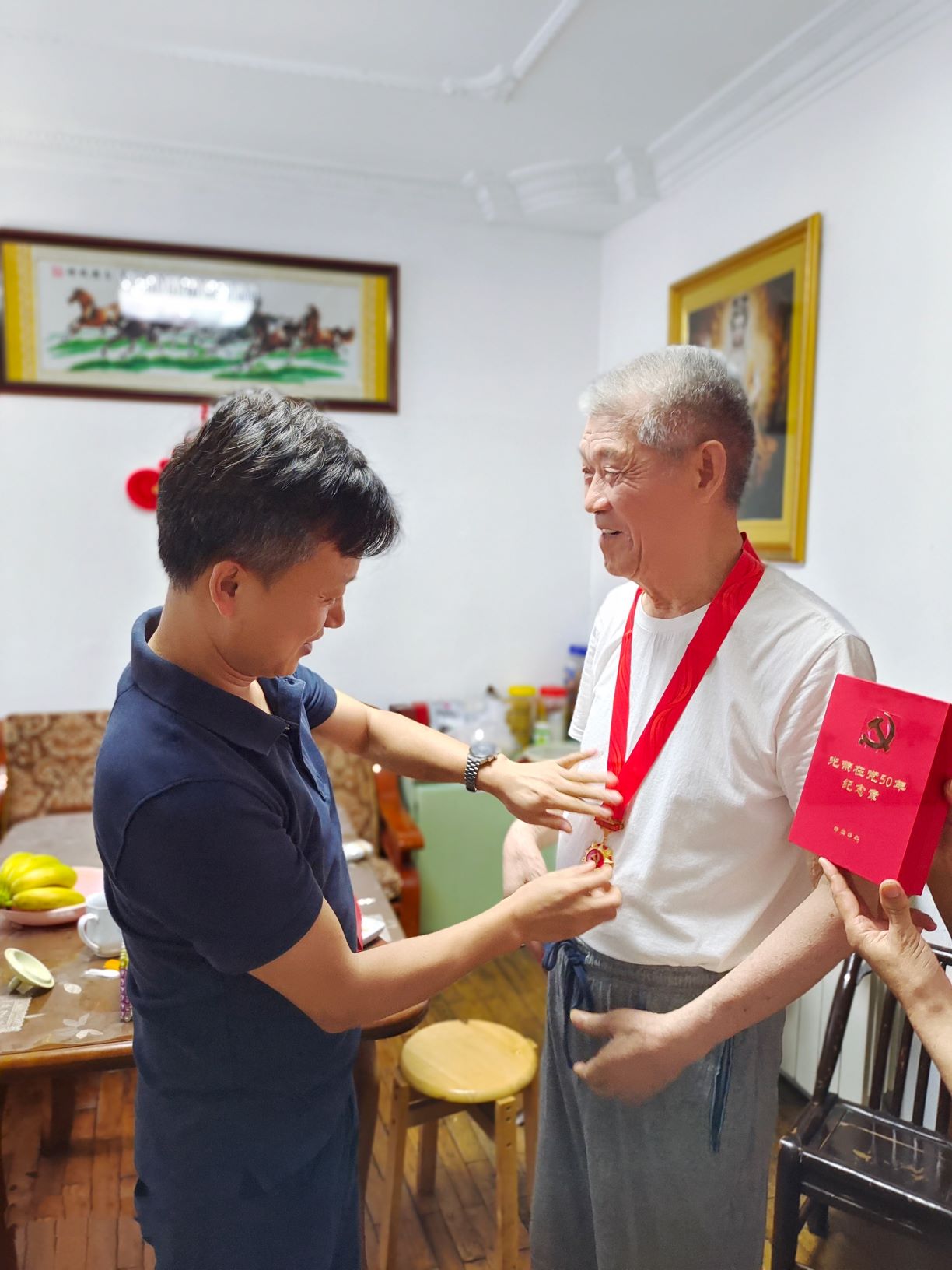 为老党员佩戴“光荣在党50年”纪念章