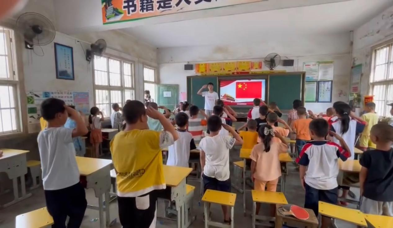 聆听红色故事弘扬革命精神。实践团队还将抗战老兵肖育治的故事带进了东边中学的课堂之中。志愿者们通过讲解抗战老兵的故事,引领学生们重温中国共产党的辉煌历程,带领学生们齐唱国歌,了解国旗与国徽背后的故事,传承红色基因,发扬红色精神。