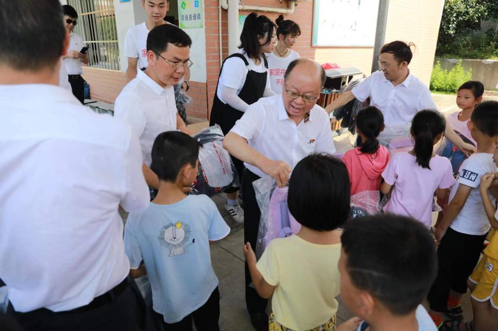 陈剑旄一行为当地小朋友送上新书包、新文具等学习礼物