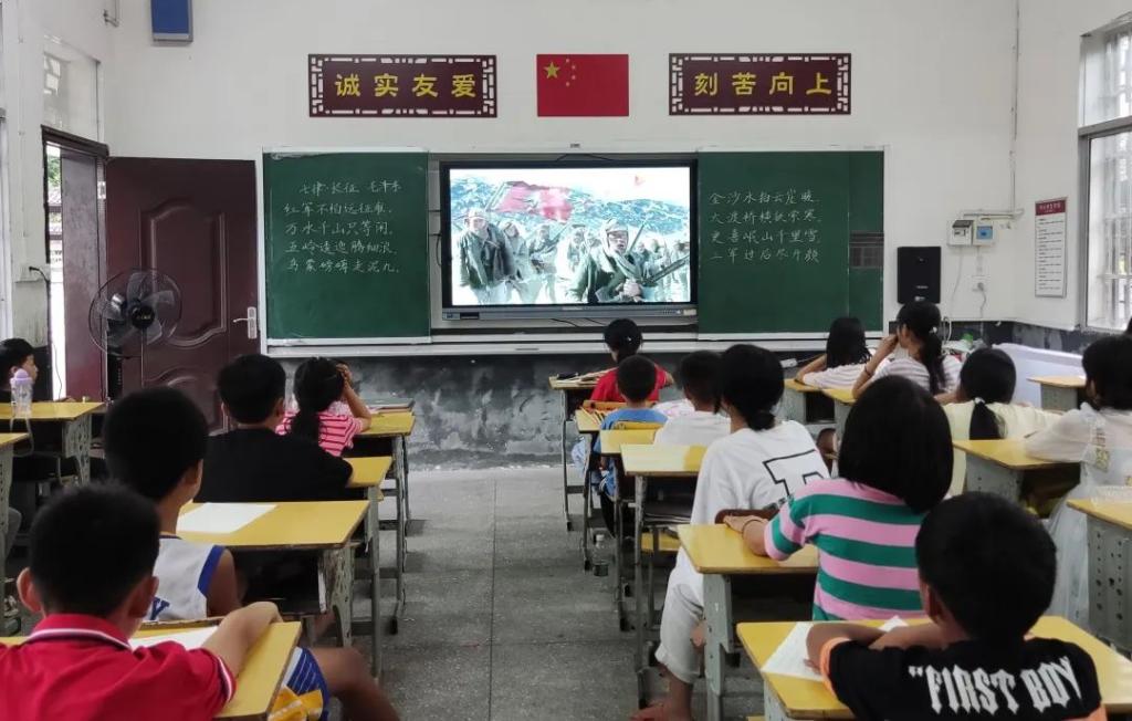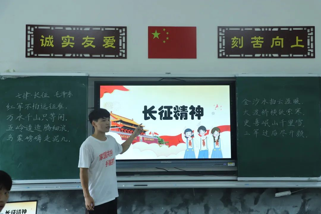 “一草一木皆忠魂,一山一石铸丰碑。”师生志愿者以长征精神为主线,通过诵读红色诗歌、习硬笔书法《七律·长征》,讲述长征中断肠就义的红军师长陈树湘,宰杀坐骑救急的威武将军彭德怀及伟大领袖毛泽东等涌现的经典英雄人物;组织观看《长征》系列电影,将经典战役“强渡大渡河”“飞夺泸定桥”,“爬雪山、过草地”等生死传奇生动再现,让中湾村的小朋友深入学习了党史知识,在红色文化自信中坚定了理想信念。