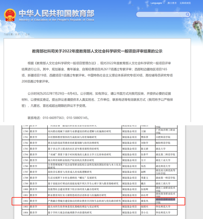 近日,教育部社科司公布2022年度教育部人文社会科学研究一般项目评审结果,beat365廖喜凤副教授主持的《产教融合型城市建设驱动的职业教育共同体生态机制与优化路径研究》课题成功立项公示。