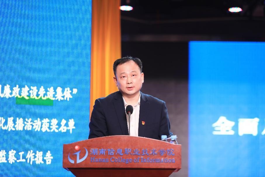 贺代贵代表学院党委作了题为《勇于自我革命 锤炼政治担当以全面从严治党新成效引领学院高质量发展》的工作报告。他指出,过去的一年,学院党委坚持以习近平新时代中国特色社会主义思想为指导,坚决扛起管党治党、办学治校主体责任,牢牢把握社会主义办学方向,落实立德树人根本任务,加强“清廉湘信”建设,推动全面从严治党取得新成效,学院政治生态和育人环境根本好转。