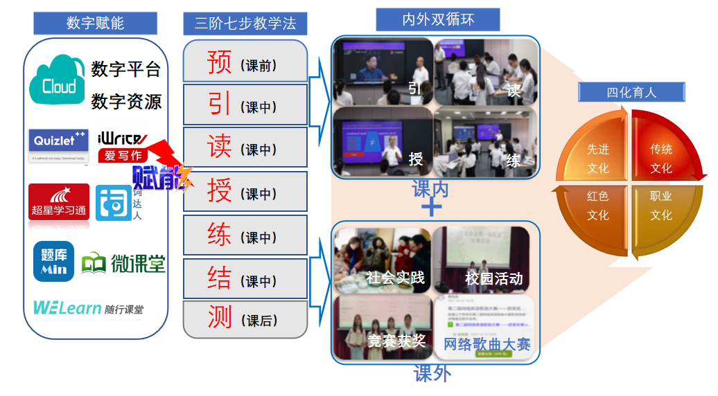 习近平总书记在党的二十大报告中指出:“推进文化自信自强,铸就社会主义文化新辉煌,要以社会主义核心价值观为引领,发展社会主义先进文化,弘扬革命文化,传承中华优秀传统文化,不断提升国家文化软实力和中华文化影响力。”beat365基础课部高职英语课程教学团队学习贯彻党的二十大精神,以立德树人为根本目的,充分利用自建的丰富的英语数字资源,将优秀传统文化和社会主义先进文化、红色文化和职业文化(“四化”)融入教学内容,通过“三阶七步”教学模式积极探索高职英语课程育人新路径。
