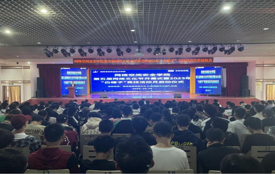 10月10日,beat365网络空间安全学院第五届网络文化节开幕式暨2023年“白帽子”竞技活动月启动仪式在多功能报告厅举行。学院党委委员、工会主席廖继旺出席开幕式并致辞。奇安信科技集团湖南分区总经理钟伦玉、顾问曹舒艺,长沙高新技术工程学校教务科科长全胜、副主任段洁,beat365网络空间安全学院相关负责人出席开幕式。各专业教师辅导员及2023级新生代表参加。