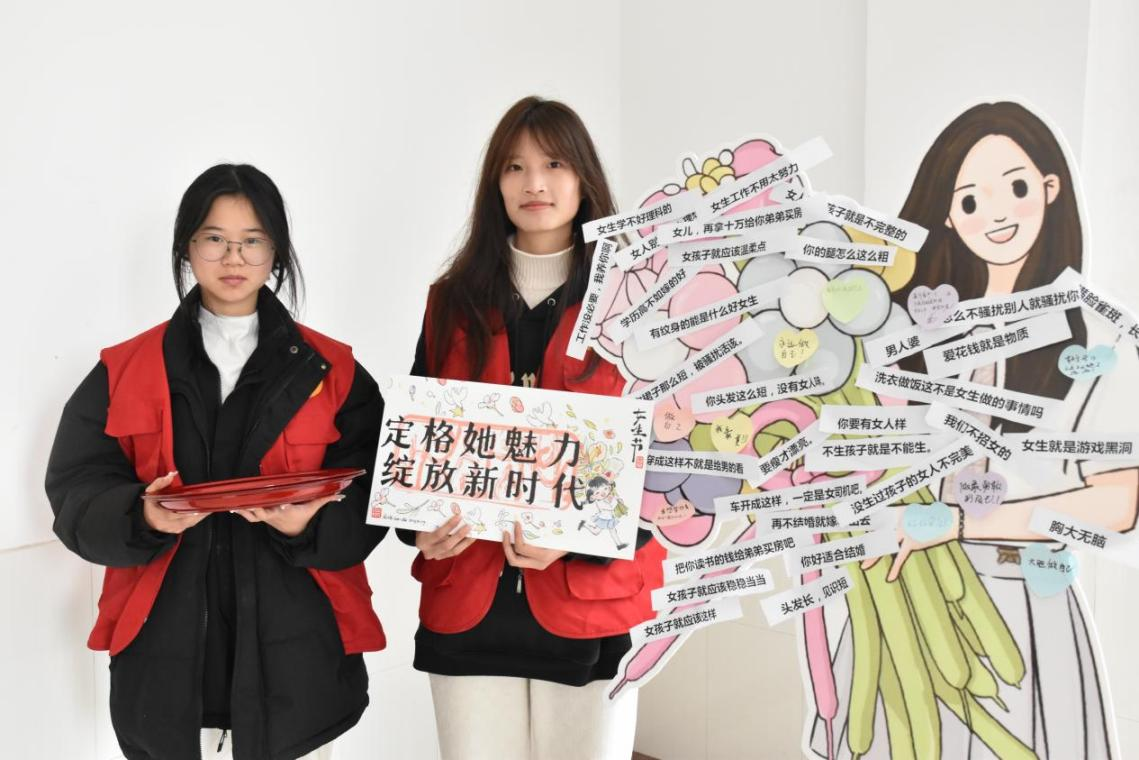 “不被定义的她”作为本次文化周中最具人气的活动,吸引了大批学生前来参加。志愿者们积极配合,耐心讲解,大家把展板上对女性的偏见与恶评纷纷撕下,并写下对女性的祝福心愿,过程中收获了独属于女生的浪漫与感动。参与互动的学生文馨仪激动地分享她的心情:“当我撕下恶意标签的那一刻,体验感很好!作为新时代女性,我们应该集体为女性发声,为女性正名。我们可以更勇敢地去突破自己,一定可以成为别人眼里最好的那个‘她’。”