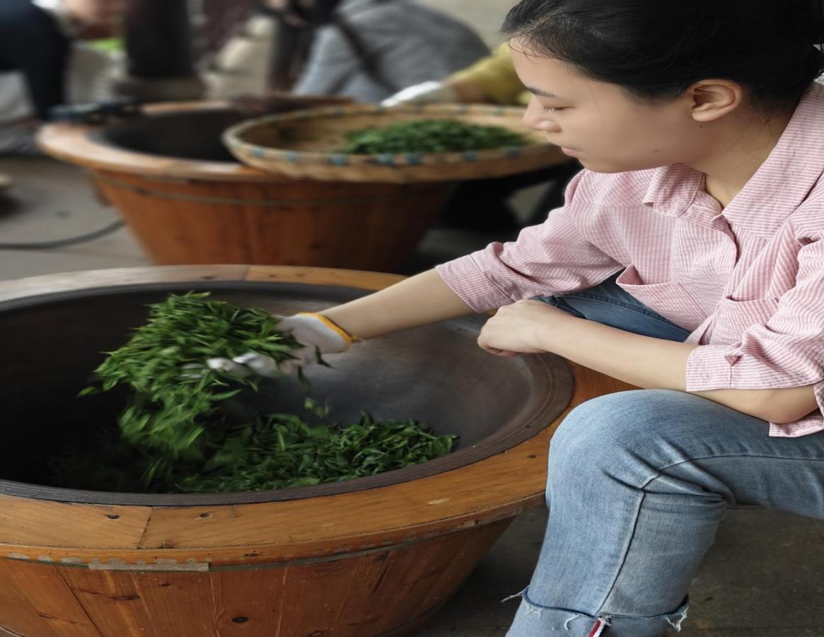 “今天我们制作手工茶,提手采这是有机绿茶的主要采法,可以通过‘看、闻、摸’等方式对鲜叶的嫩度、鲜度、净度、匀度进行逐一辨识,茶叶采摘后,再通过杀青、揉捻、炒二青等流程……”,国家一级茶艺师、评茶技师、制茶师颜艳辉老师现场教授绿茶的采摘、制作等工艺流程,茶艺教师全程参与制作。