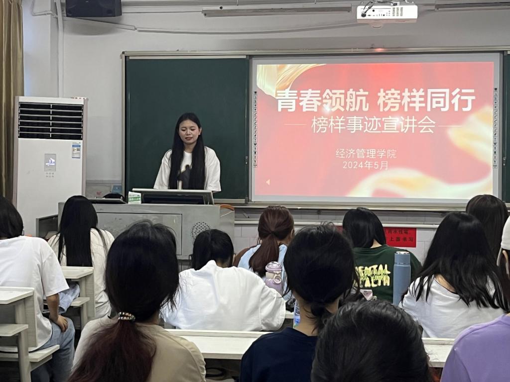“用身边人讲身边事,用身边事感染身边人”,在湖南信息职院经管院的各个教室里,一场主题为“青春领航,榜样同行”的事迹宣讲为“青春五月”主题系列活动划上圆满句号。“五四评优”中荣获“优秀团员”“优秀团干”“向上向善好青年”称号的同学们纷纷走进学生群体里,分享自己的奋斗故事。商英2202班的杨佩仪听了同班同学“爱岗敬业好青年”张雯婷的事迹宣讲后深受鼓舞,她表示自己也要向优秀看齐,做新时代肯奋斗的好青年。