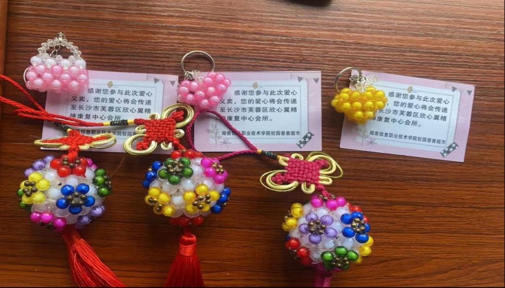 此次爱心活动采用了“线上+线下”“校内+校外”模式,紧密围绕续写新时代雷锋精神主旨,以实际行动庚续“雷锋精神”,传承榜样力量。活动现场售卖的手工艺品均由精神障碍人群亲手制作的,参与活动的志愿者在朋友圈、微视频平台进行了广泛宣传。“感谢您参与此次爱心义卖,您的善举将传递至长沙市芙蓉区欣心翼精神康复中心会所。”活动现场,大家纷纷驻足挑选心仪的手工艺品,购买者还收获了志愿者亲手制作的爱心卡片。