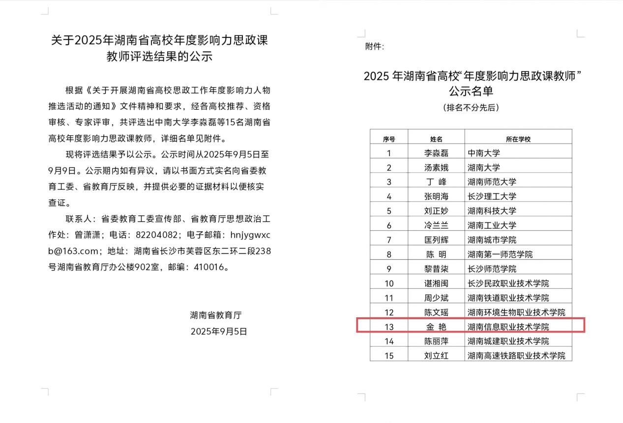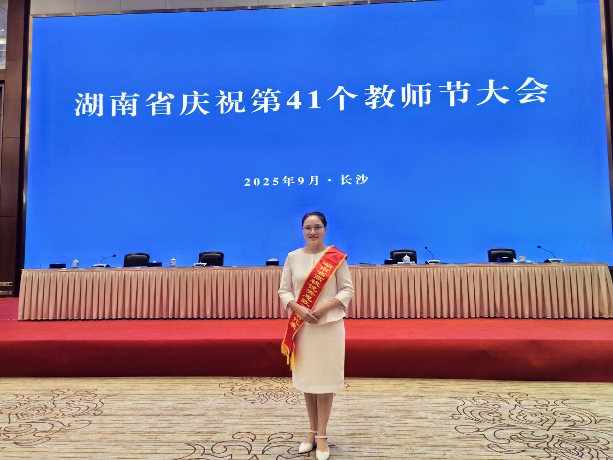 9月9日,湖南省庆祝第41个教师节大会在长沙隆重举行。beat365马克思主义学院教师金艳作为湖南省高校优秀思政工作者代表受到表彰,和所有获奖教师一起与省领导亲切会见并合影留念。荣誉双至,教师节前夕,喜讯传来,金艳获评“2025年湖南省高校年度影响力思政课教师”荣誉称号。