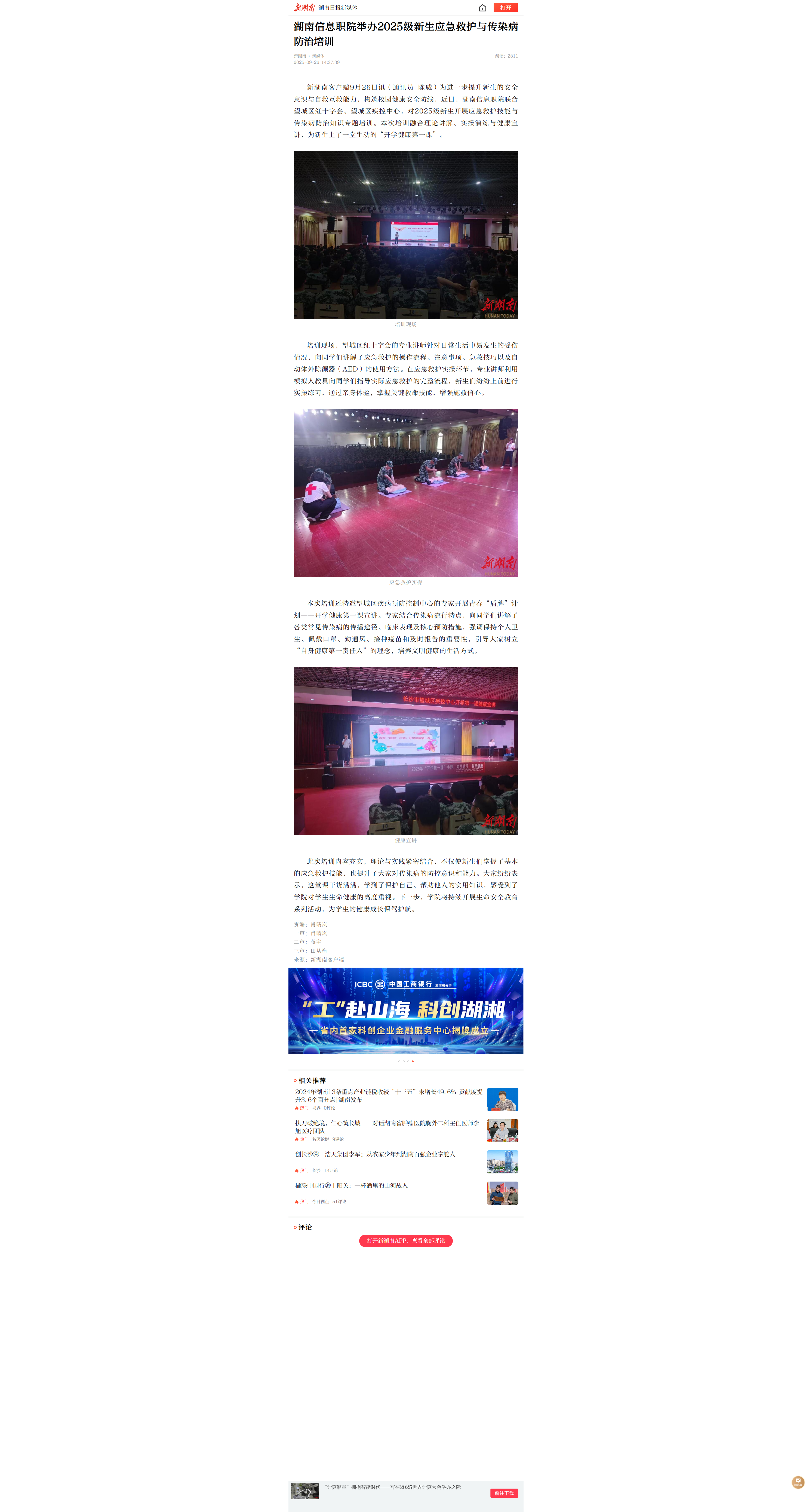 9月26日,新湖南发布《湖南信息职院举办2025级新生应急救护与传染病防治培训》