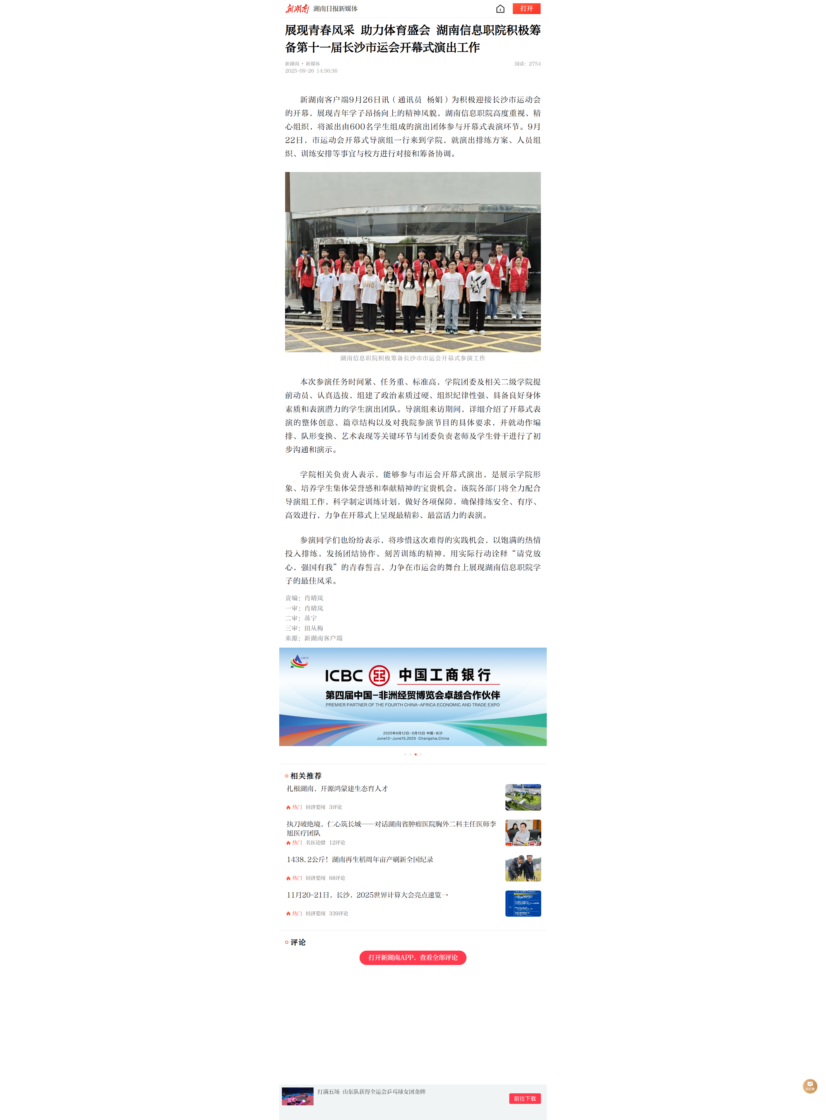 9月26日,新湖南发布《展现青春风采 助力体育盛会 湖南信息职院积极筹备第十一届长沙市运会开幕式演出工作》