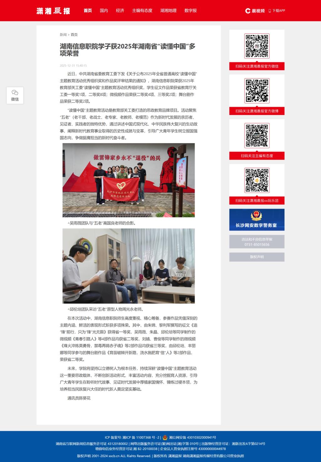 12月31日,潇湘晨报发布《湖南信息职院学子获2025年湖南省“读懂中国”多项荣誉》