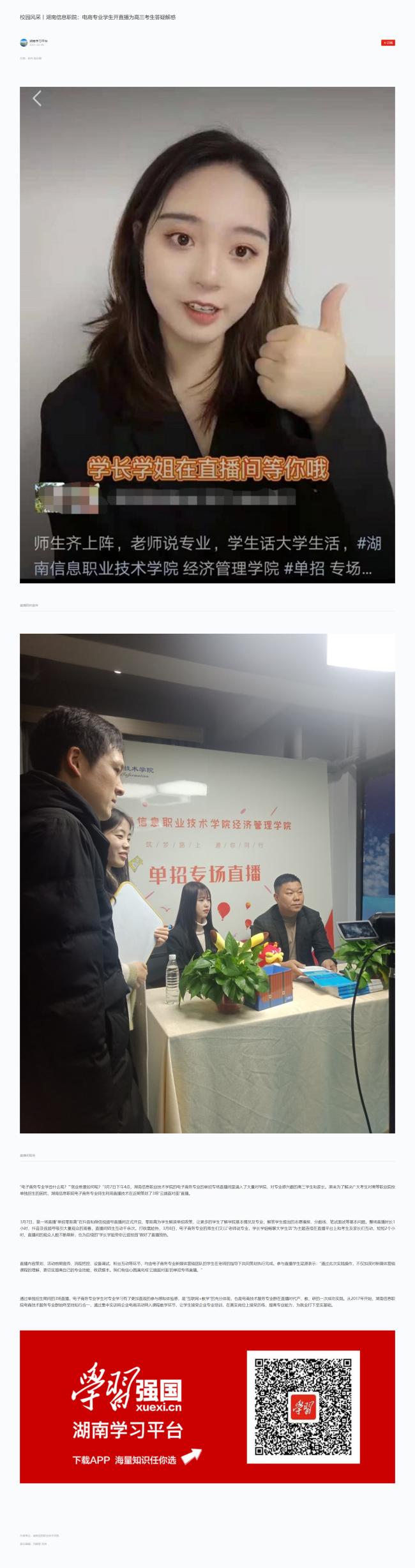 3月9日,学习强国发布《校园风采丨湖南信息职院:电商专业学生开直播为高三考生答疑解惑》。