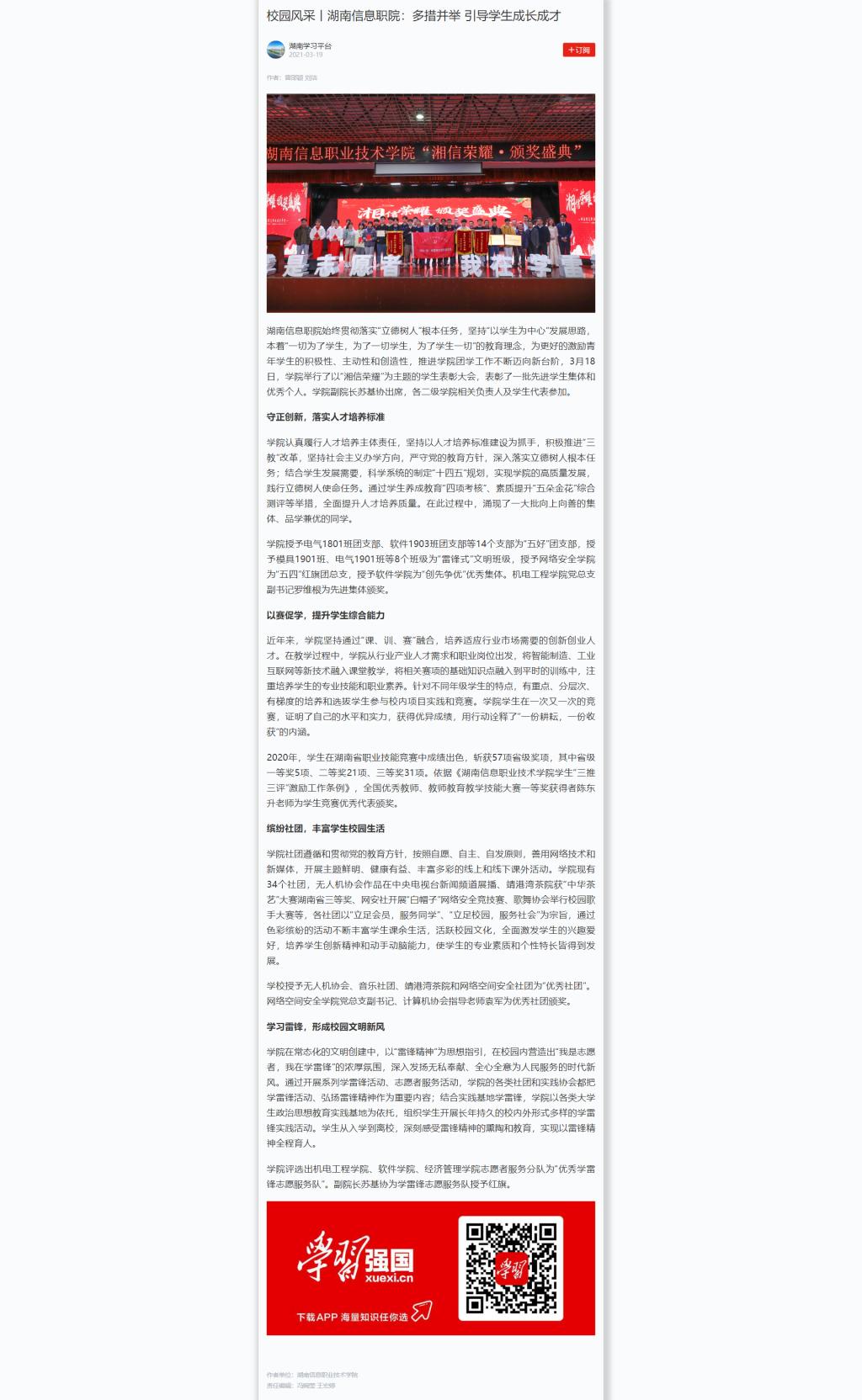 3月19日,学习强国发布《校园风采丨湖南信息职院:多措并举 引导学生成长成才》。