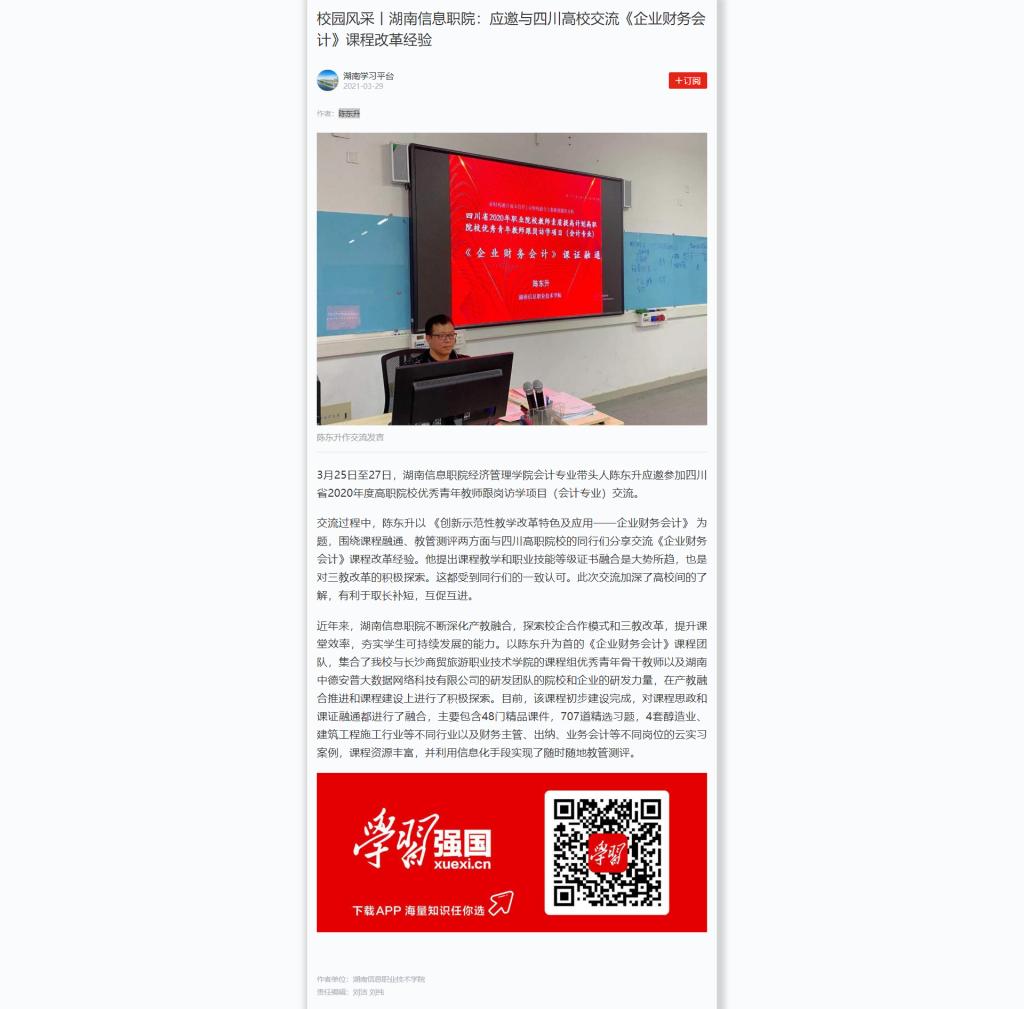 3月29日,学习强国发布《校园风采丨湖南信息职院:应邀与四川高校交流《企业财务会计》课程改革经验》。