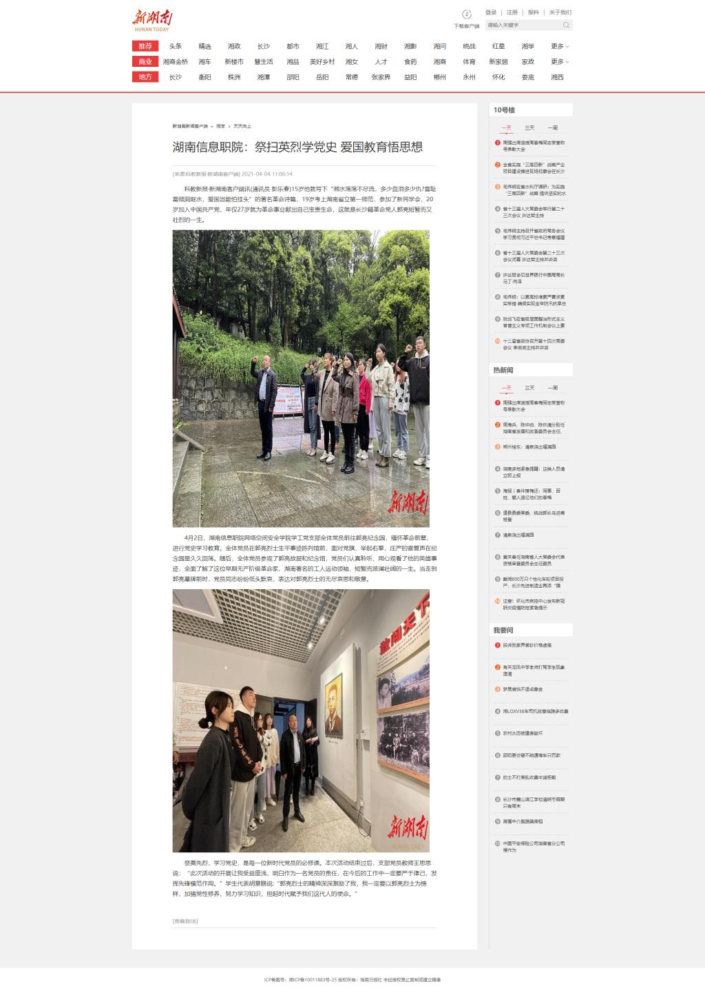4月4日,新湖南发布《湖南信息职院:祭扫英烈学党史 爱国教育悟思想》。