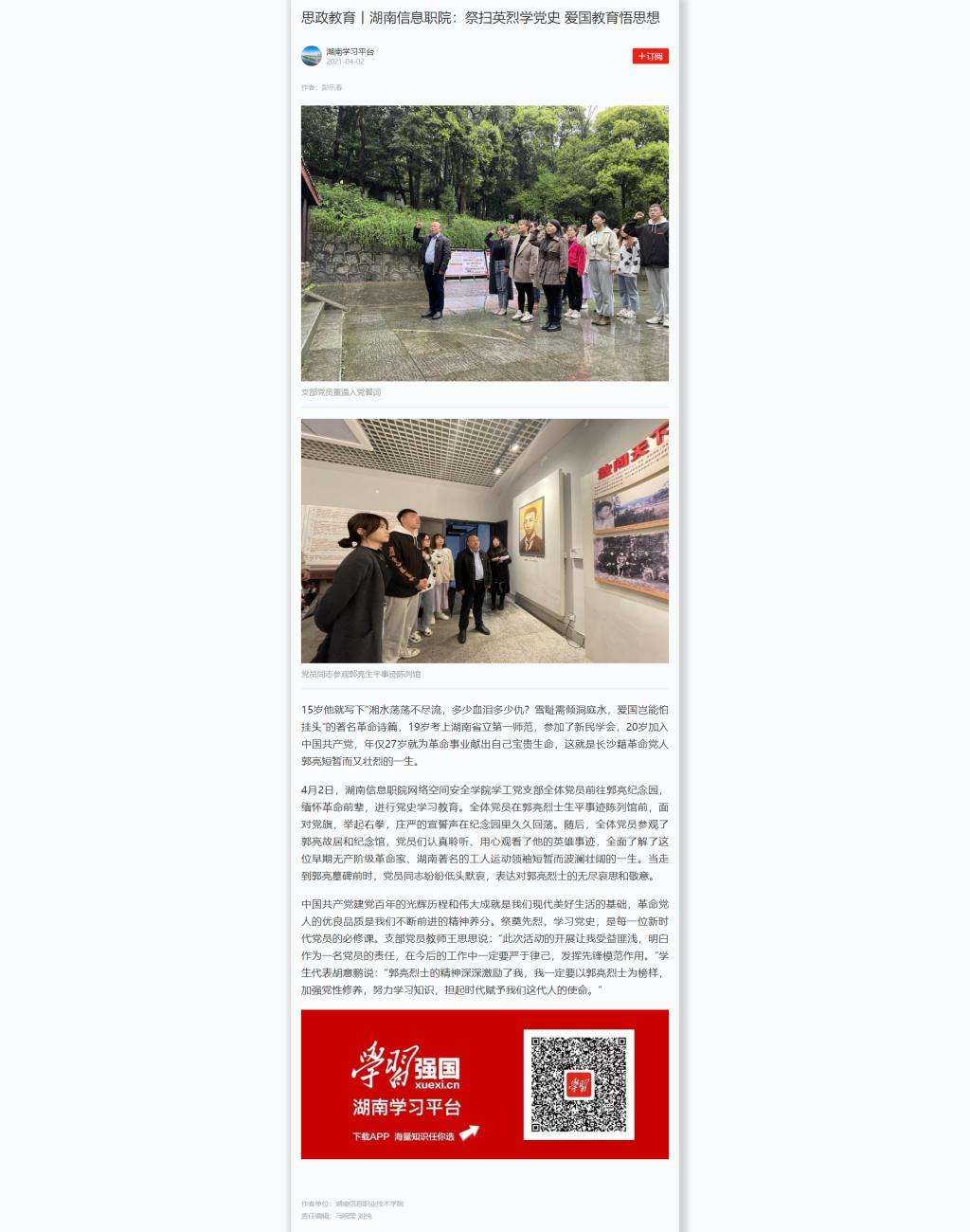 4月2日,学习强国发布《思政教育丨湖南信息职院:祭扫英烈学党史 爱国教育悟思想》。