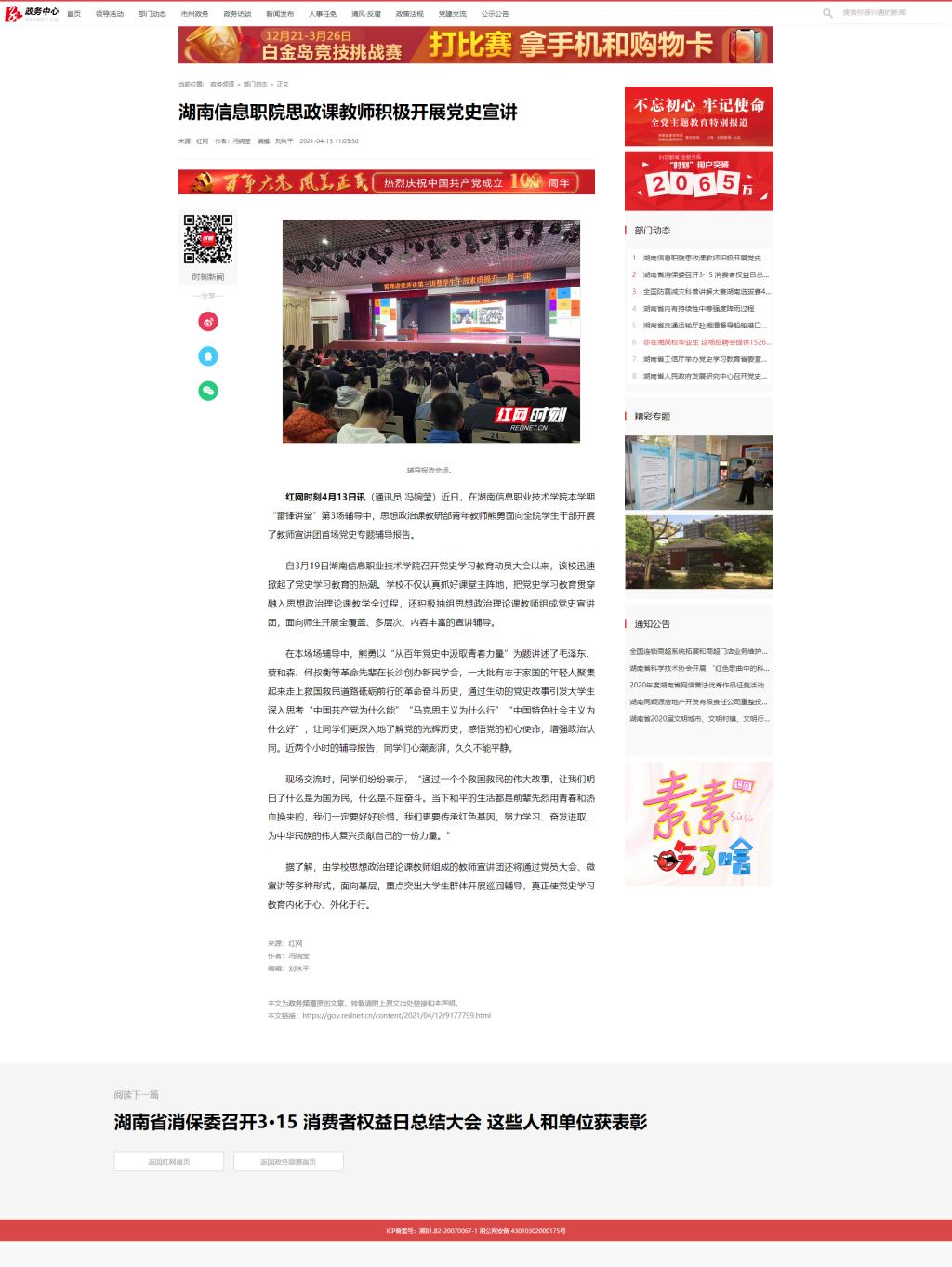 4月13日,红网发布《湖南信息职院思政课教师积极开展党史宣讲》。