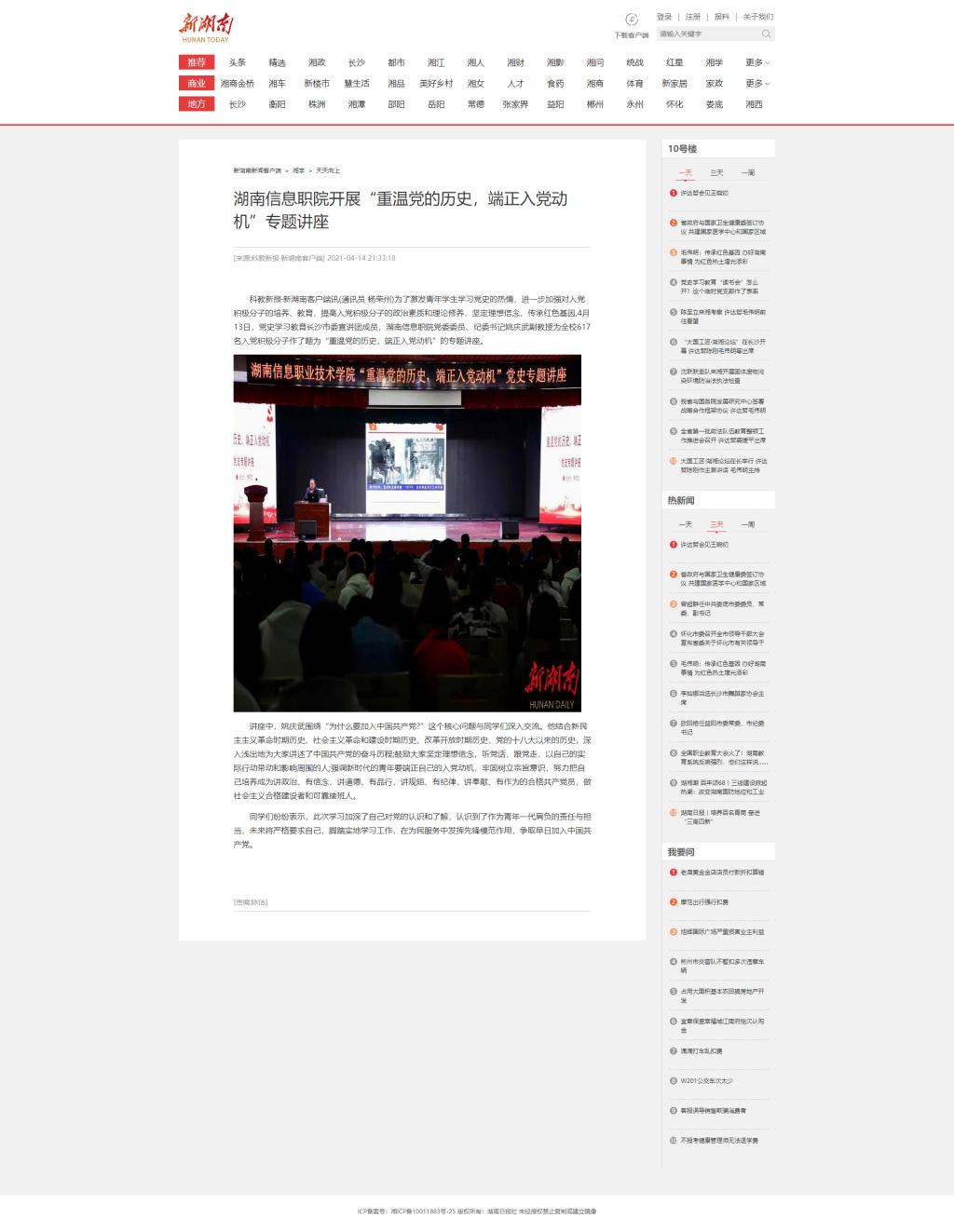 4月14日,新湖南发布《湖南信息职院开展“重温党的历史,端正入党动机”专题讲座》。