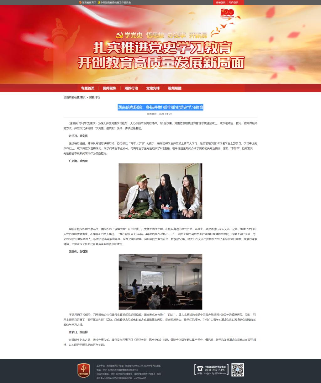 4月9日,湖南教育政务网发布《湖南信息职院:多措并举 抓牢抓实党史学习教育》。