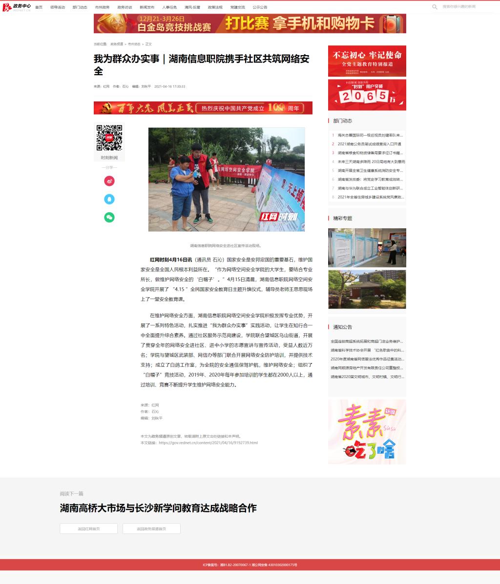 4月16日,红网发布《我为群众办实事|湖南信息职院携手社区共筑网络安全》。