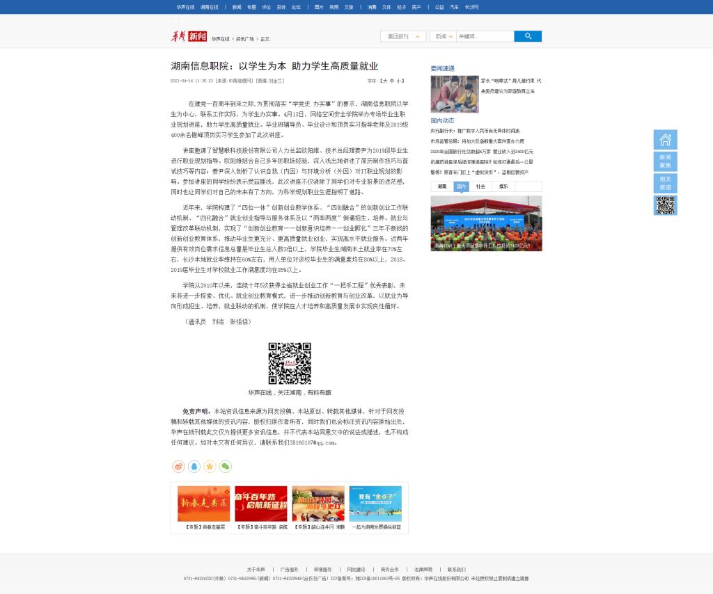 4月16日,华声在线发布《湖南信息职院:以学生为本 助力学生高质量就业》。