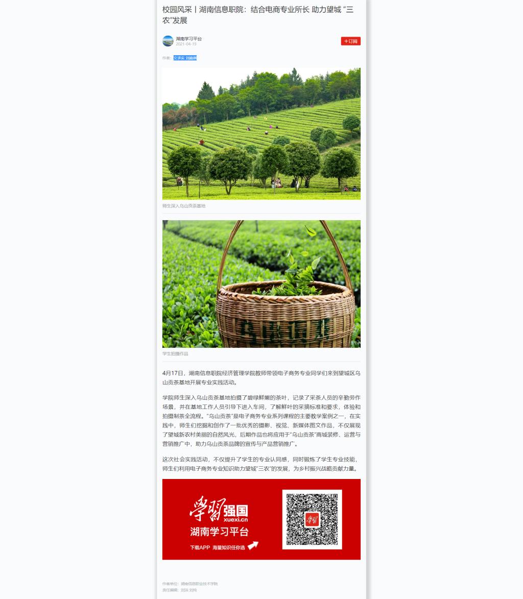 4月19日,学习强国发布《校园风采丨湖南信息职院:结合电商专业所长 助力望城 “三农”发展》