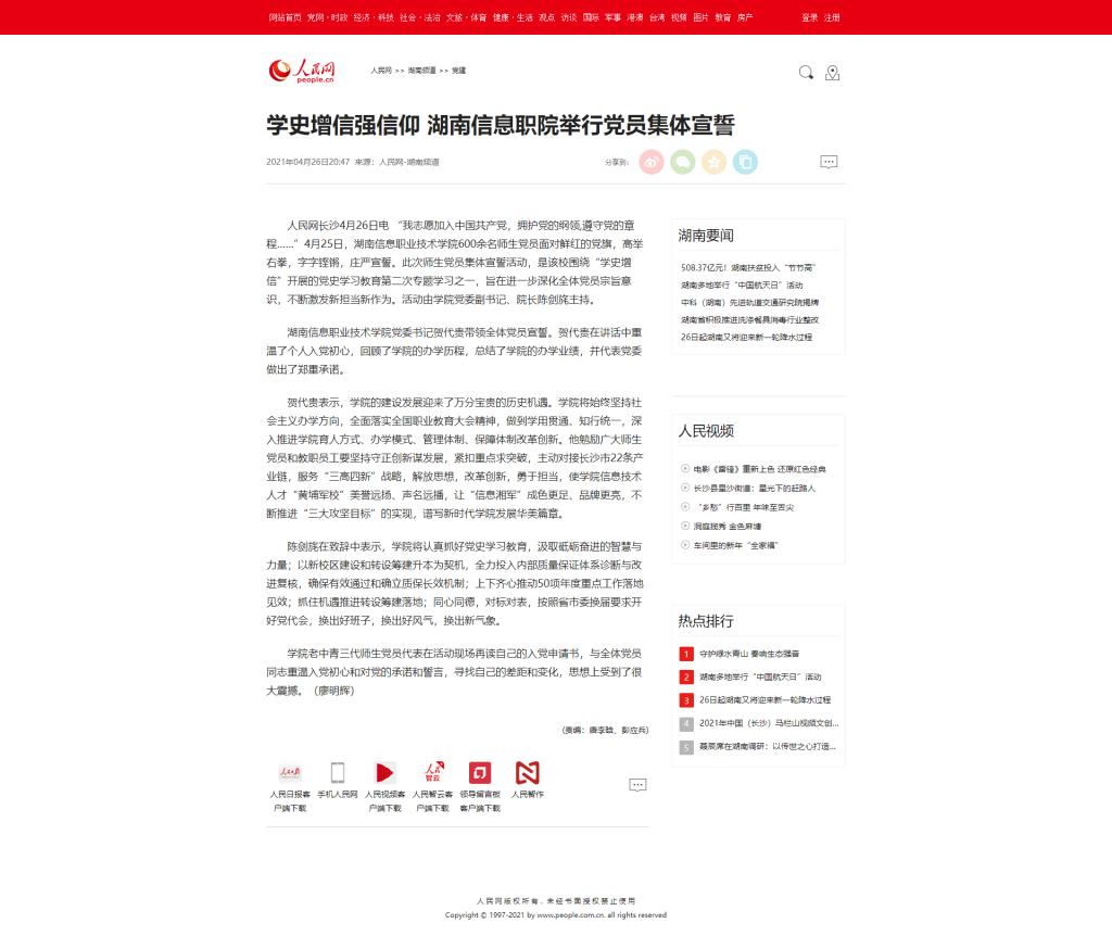 4月26日,人民网发布《学史增信强信仰 湖南信息职院举行党员集体宣誓》。