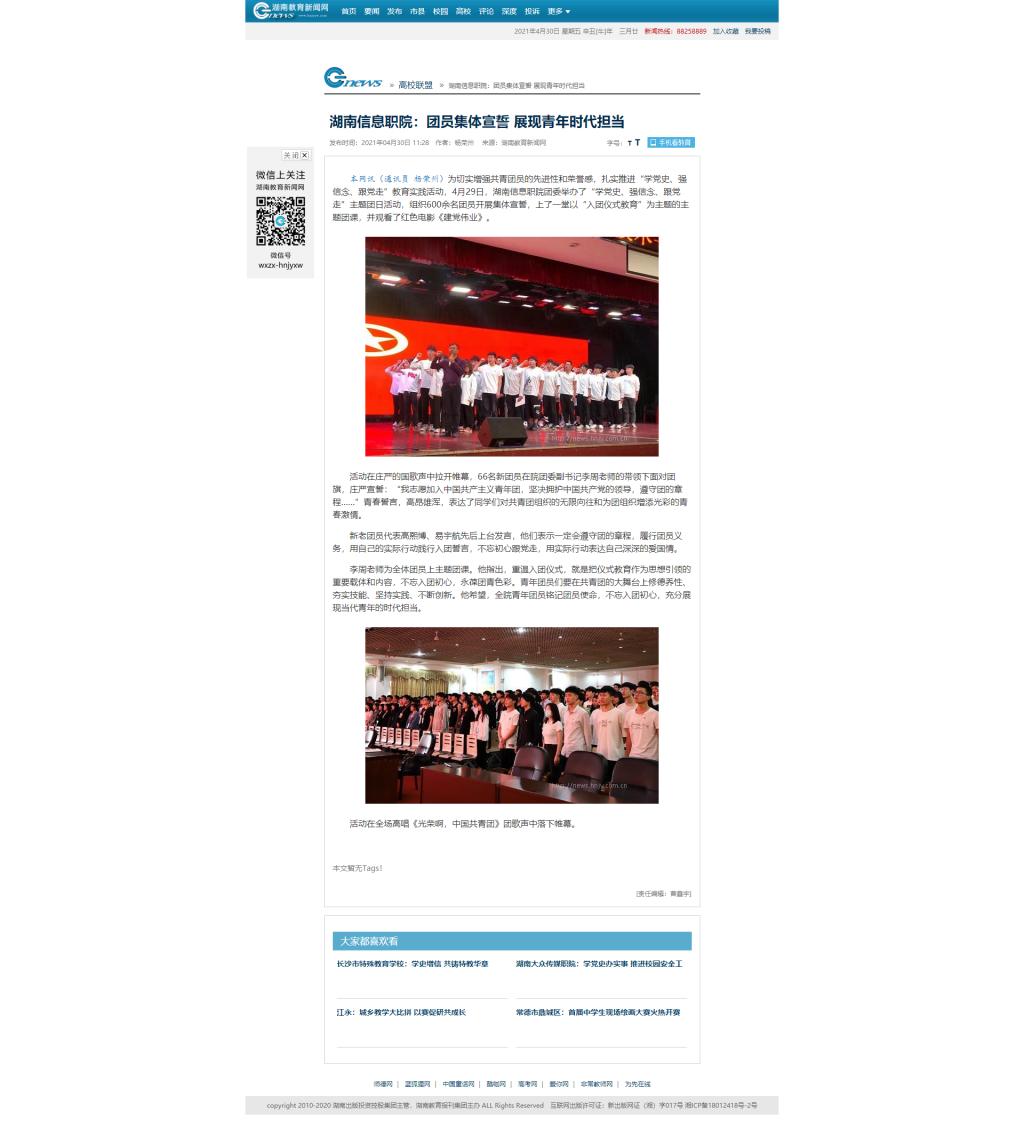 4月30日,湖南教育新闻网发布《湖南信息职院:团员集体宣誓 展现青年时代担当》。