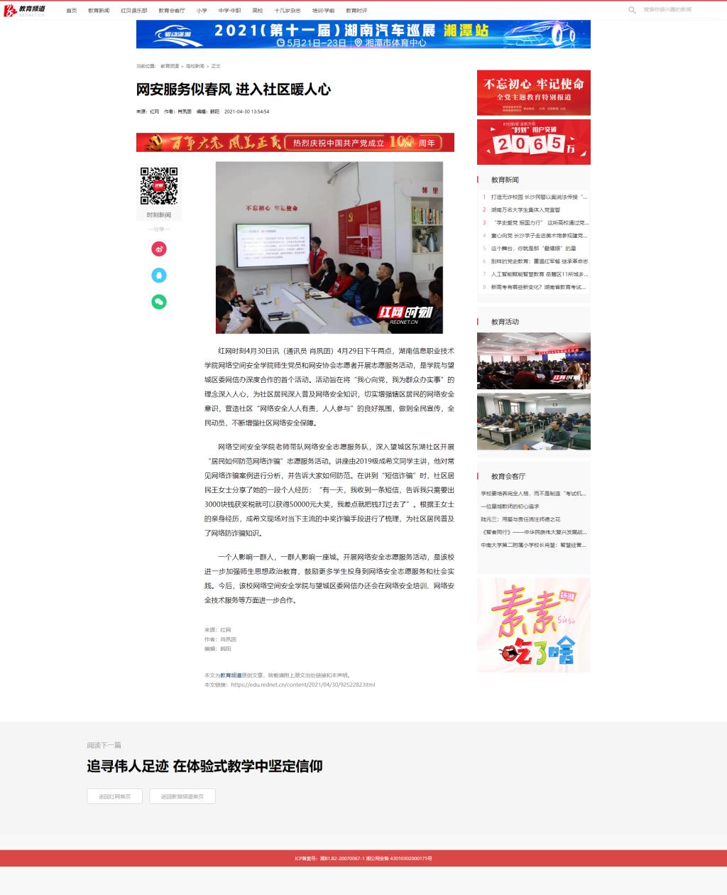4月30日,红网发布《网安服务似春风 进入社区暖人心》。