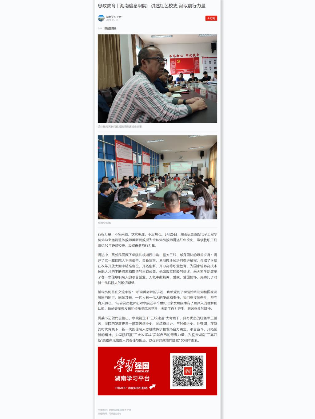 5月26日,学习强国发布《思政教育丨湖南信息职院:讲述红色校史 汲取前行力量》。