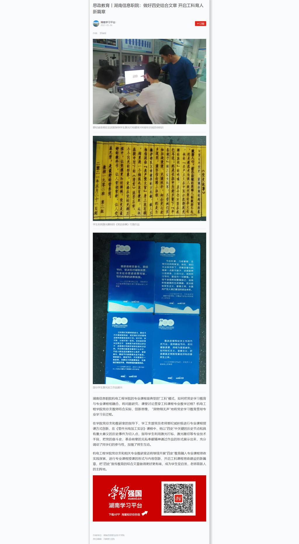 5月26日,学习强国发布《思政教育丨湖南信息职院:做好四史结合文章 开启工科育人新篇章》。