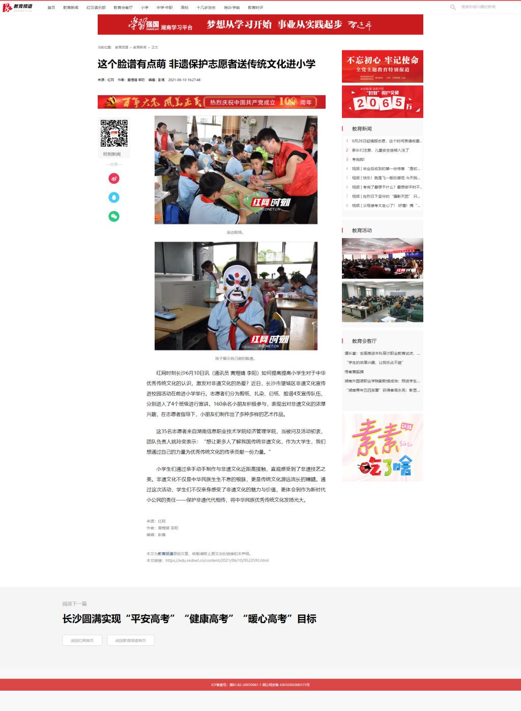 6月10日,红网发布《这个脸谱有点萌 非遗保护志愿者送传统文化进小学》。