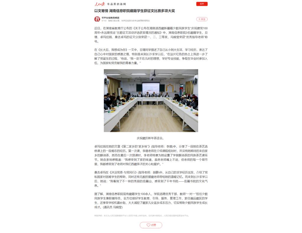 7月3日,人民日报发布《以文寄情 湖南信息职院藏籍学生获征文比赛多项大奖》。