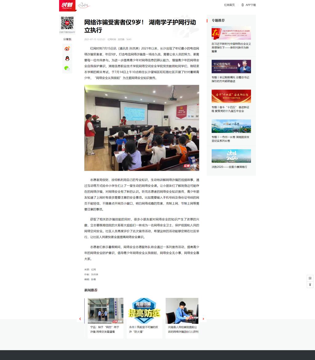 7月15日,红网发布《网络诈骗受害者仅9岁! 湖南学子护网行动立执行》。