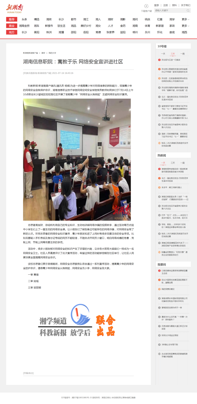 7月16日,新湖南发布《湖南信息职院:寓教于乐 网络安全宣讲进社区》。