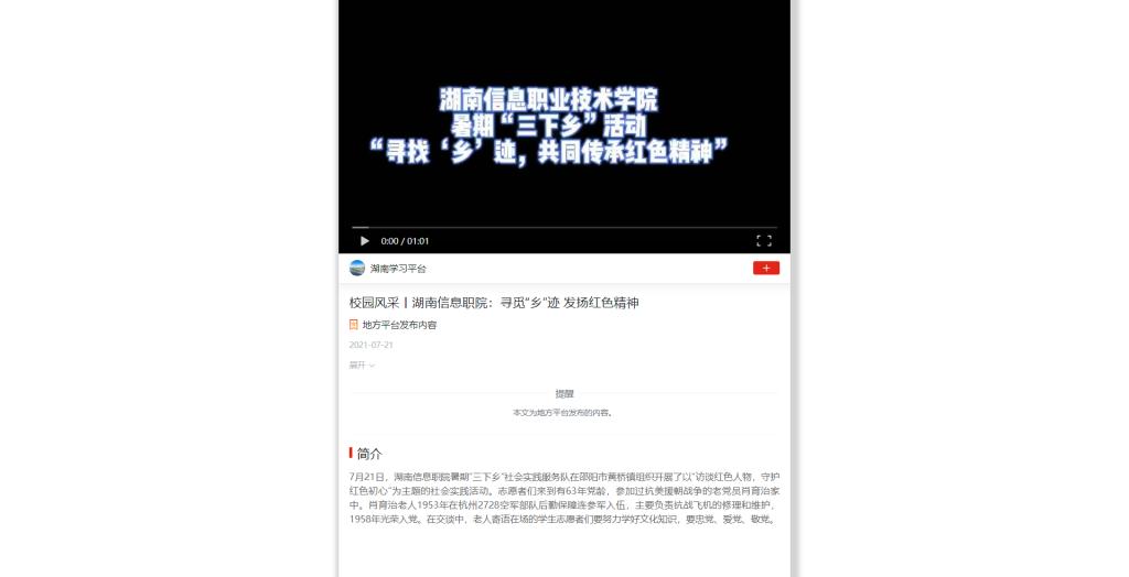 7月21日,学习强国发布《校园风采丨湖南信息职院:寻觅“乡”迹 发扬红色精神》。