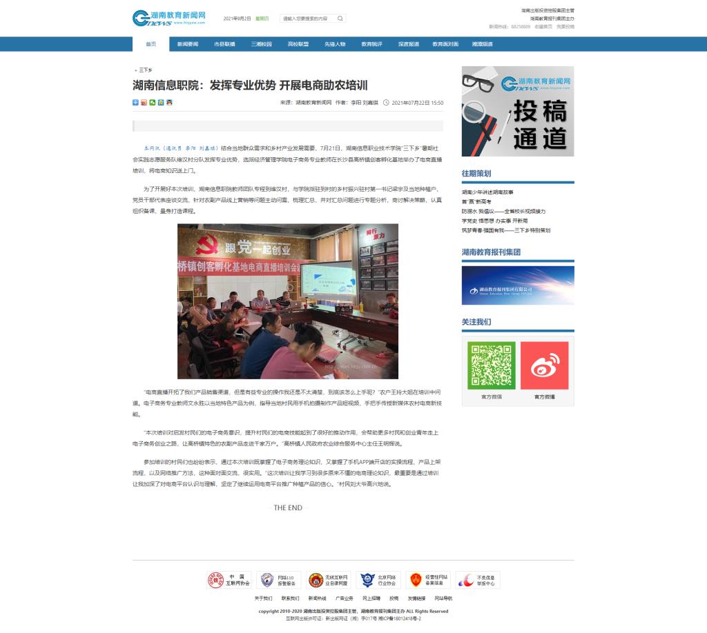 7月22日,湖南教育新闻网发布《湖南信息职院:发挥专业优势 开展电商助农培训》。