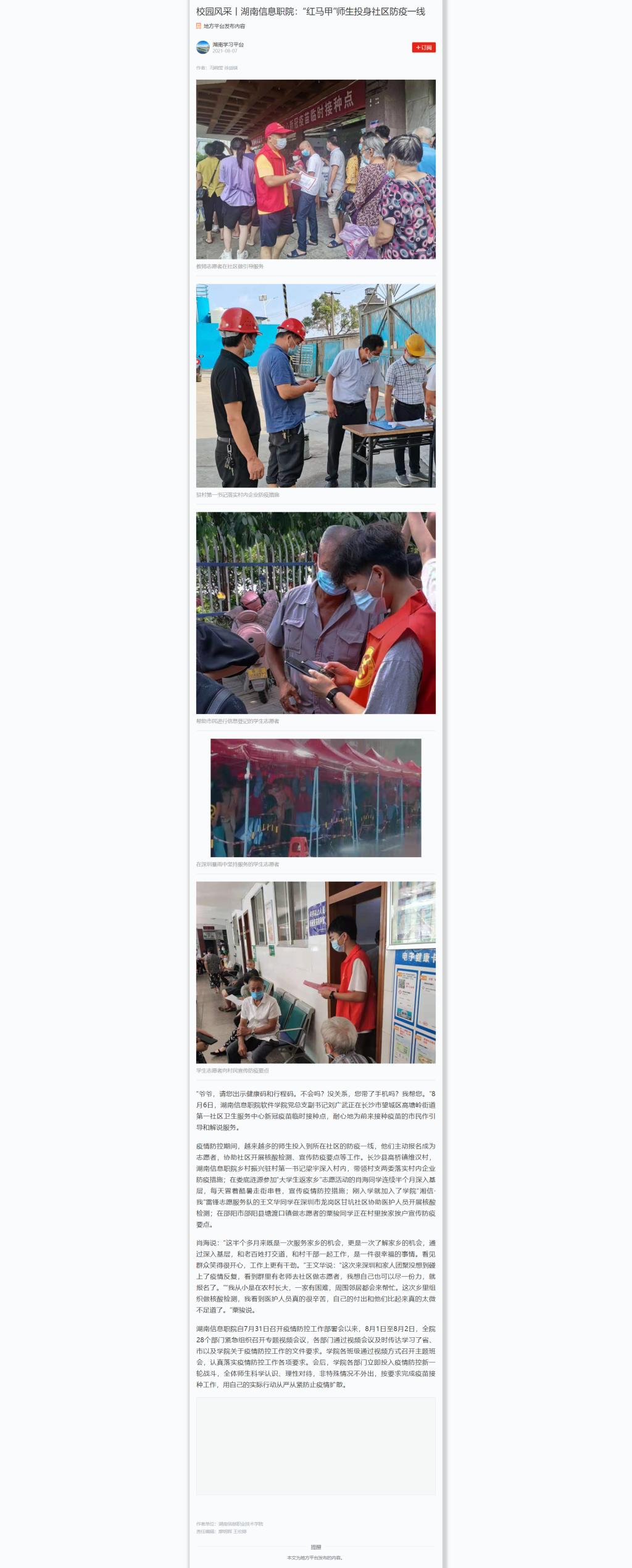 8月7日,学习强国发布《校园风采丨湖南信息职院:“红马甲”师生投身社区防疫一线》。