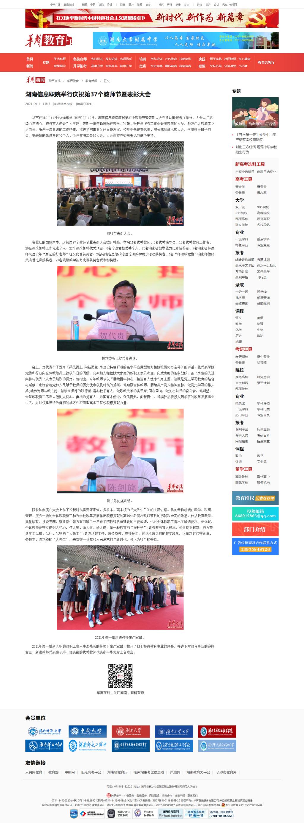 9月11日,华声在线发布《湖南信息职院举行庆祝第37个教师节暨表彰大会》。