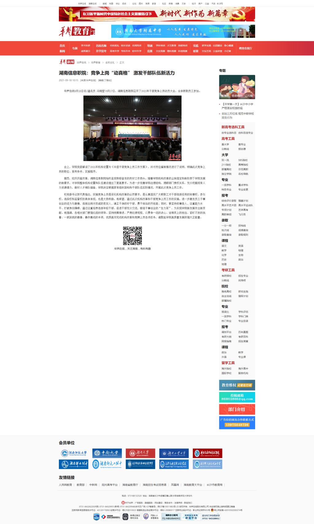 9月18日,华声在线发布《湖南信息职院:竞争上岗“动真格” 激发干部队伍新活力》。
