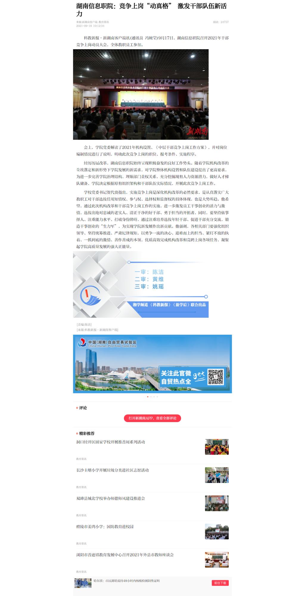 9月18日,新湖南发布《湖南信息职院:竞争上岗“动真格” 激发干部队伍新活力》。