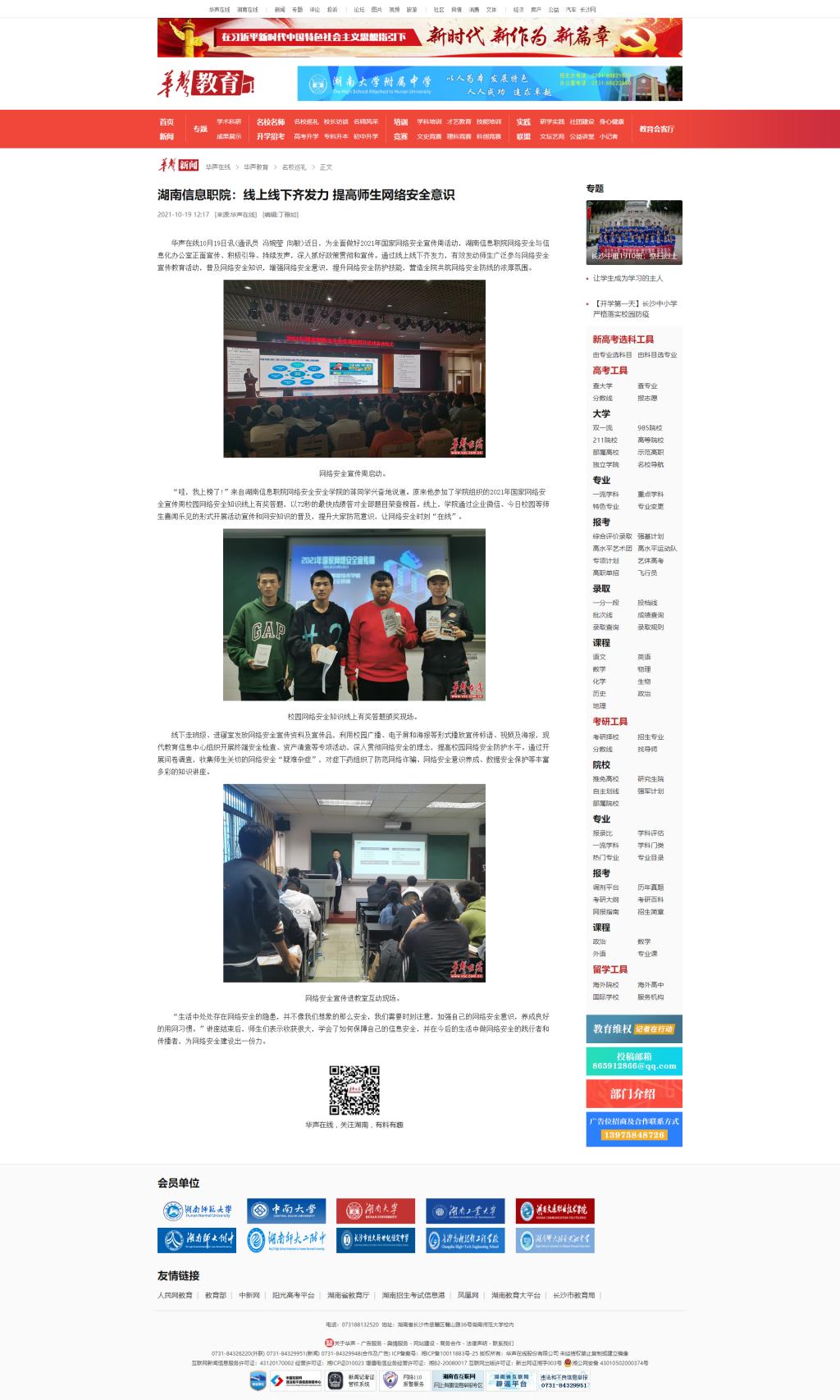 10月19日,华声在线发布《湖南信息职院:线上线下齐发力 提高师生网络安全意识》。