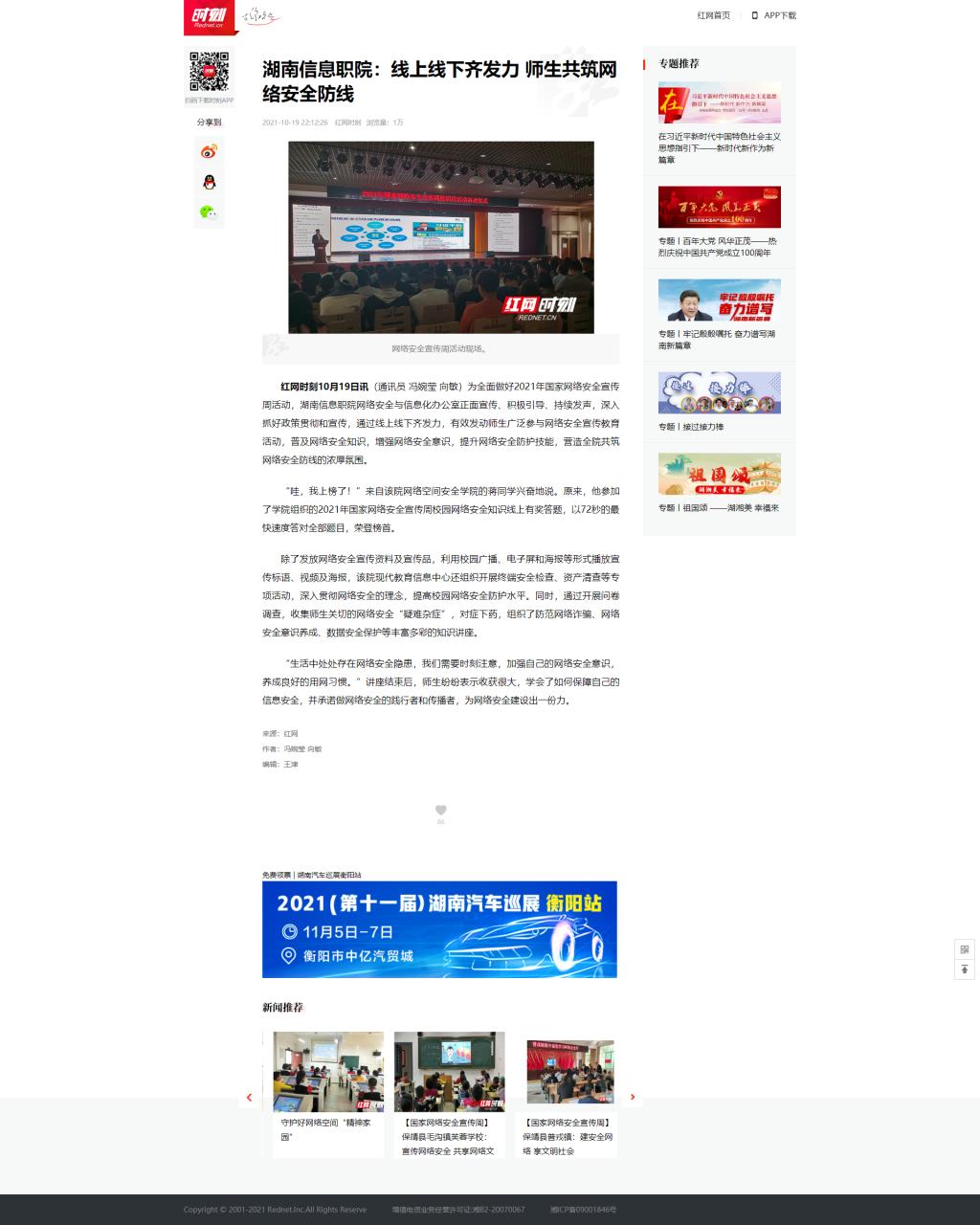 10月19日,红网发布《湖南信息职院:线上线下齐发力 师生共筑网络安全防线》。