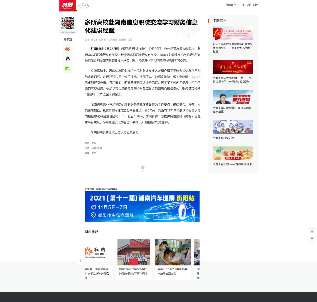 10月22日,红网发布《多所高校赴湖南信息职院交流学习财务信息化建设经验》。