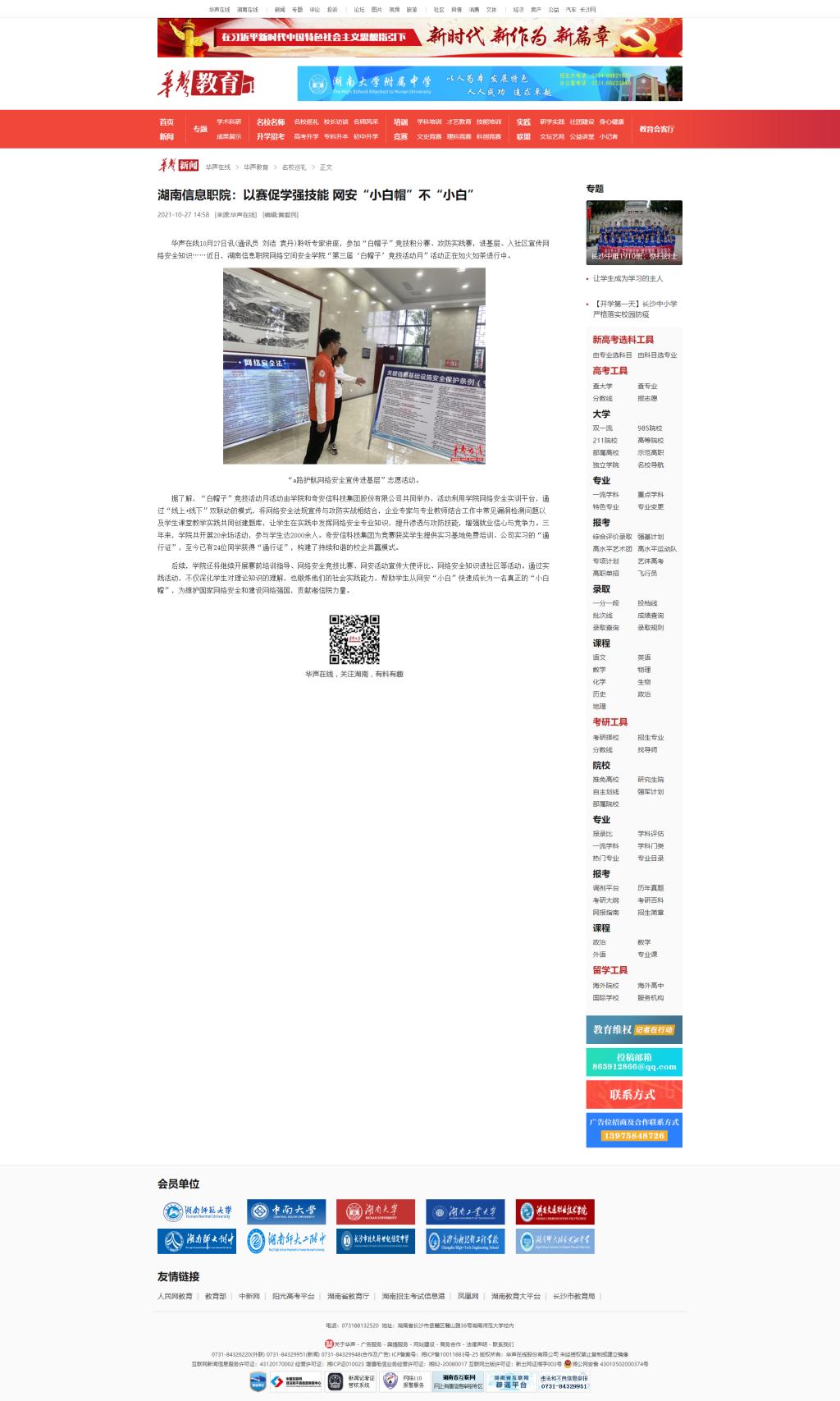 10月27日,华声在线发布《湖南信息职院:以赛促学强技能 网安“小白帽”不“小白”》。